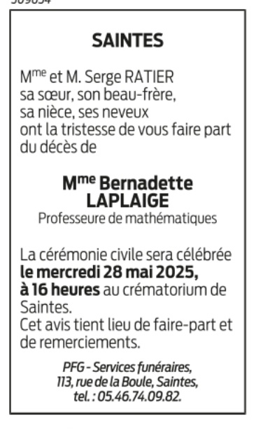 On nous a annoncé le décès de Bernadette Laplaige qui était une ancienne choriste de Vox Santona, membre du bureau et webmaster. Des membres du choeur seront présents à cette cérémonie pour l'accompagner.